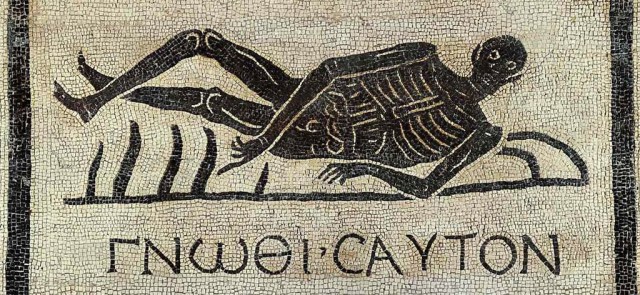 If somewhere on a rung between seeking Information and seeking Knowledge, certainly in part I am seeking knowledge about myself. I don’t feel I need a Memento mori, and I am not studying philosophy to prepare for death. I accept that, like most people, I have character flaws, but I don’t feel my soul is sick and in need of healing, and as a theory of human constitution I detest the concept of sin. But disassociated from these notions, “Know thyself,” one of several maxims the seven Greek Sages, according to the Greek antiquarian Pausanias, had inscribed in the forecourt of the Temple of Apollo at Delphi, has always seemed to me like sound advice (as does Μηδὲν ἄγαν, Nothing in excess). Self-knowledge (to be distinguished from self-absorption) is undoubtedly a valuable aid in navigating life, and philosophy can help you know yourself, at a minimum indirectly. To philosophize is to ask questions about things. Almost inevitably that includes asking questions about yourself. (Of course in our era there is also the psychiatrist’s couch.)