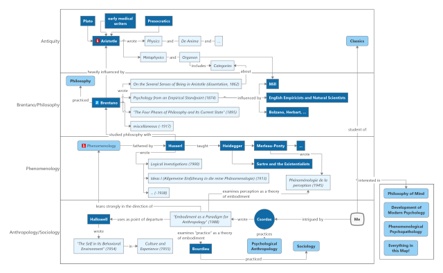 Note: The number ‘1’ in the Map in front of Phenomenology and Aristotle, and the number ‘2’ in front of Brentano, are what MindManager calls priority icons. I have relatively little time left in the only life I am ever going to be given, and these are just suggestions to myself about the prioritization of my reading … and probably in vain. In the Phenomenology space, once I go back to Brentano and then pick up again with Husserl, I intend my next stop to be Merleau-Ponty’s Phénoménologie de la perception, whose Avant-propos attempts to answer the question, Qu’est-ce que la phénoménologie? If I ever finally get an answer to that question that I can articulate, I will let you know! (It is easy enough to find in handbooks and encyclopedia articles the laundry list of what Merleau-Ponty calls the “famous phenomenological themes.” But MP says we cannot come to an understanding about phenomenology via a philological commentary on texts [i.e., on Husserl and Heidegger]. Rather, Cést en nous-mêmes que nous trouverons l’unité de la phénoménologie et son vrai sens …. Essayons donc de nouer délibérément les fameux thèmes phénoménologiques comme ils sont noués spontanément dans la vie.)