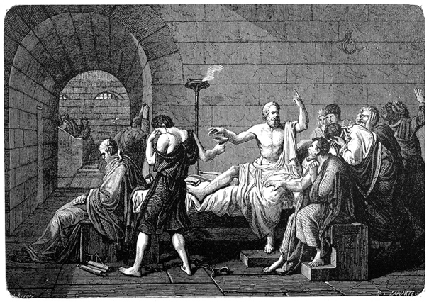when blogging about philosophy specifically, if I think about it and am honest about it (which seem like good ideas when talking about philosophy!), am I not really sharing my thoughts with myself more than with others? I am not sure. Contrast the two representations above of Socrates. In the Platonic representation, philosophizing is an activity between men as social animals. Socrates dialogs with his companions right up to drinking the hemlock. In the other (a statue of Socrates outside the Academy of Athens), philosophizing is represented as a solitary activity.