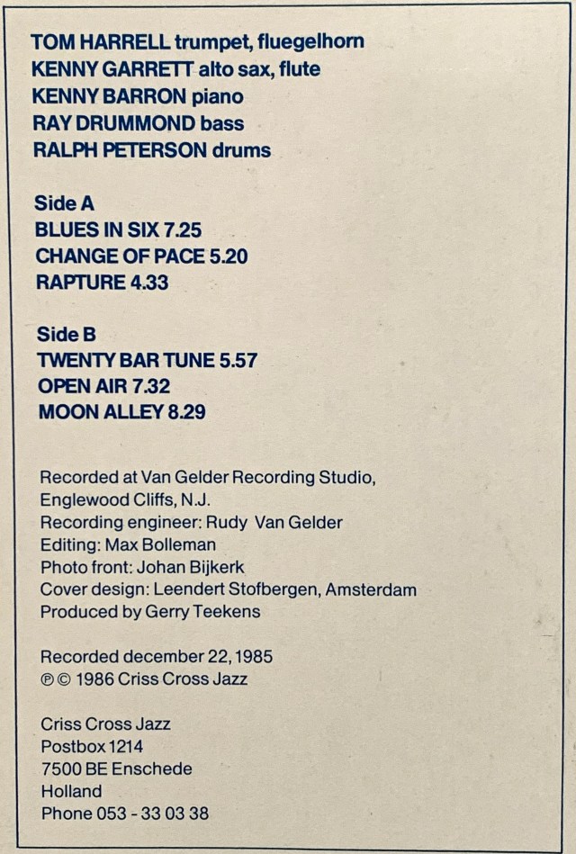 (Harrell had appeared on two SteepleChase albums in 1979, Lee Konitz’s Yes, Yes Nonet and Look to the Sky, the John McNeil-Tom Harrell pairing, both recorded however in New York.)