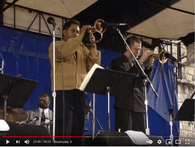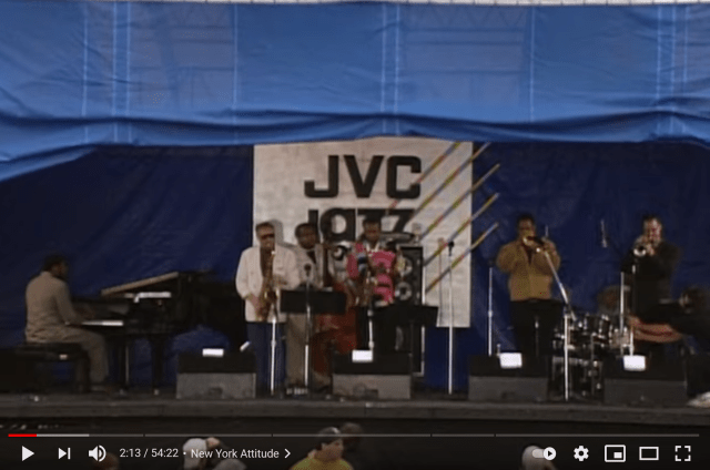 Drummond’s bass kicks off Watson’s nifty composition Beatitudes. There are a couple funny moments while the four horns lay down the theme. Faddis enthusiastically blurts out some rather distinct notes and Watson turns to him, alto sax still in mouth, but with what I take to be an approving smile. Judging from this video, I would say Watson had a cheerleader role in the band; before and after 1992, Watson has many credits as an ensemble leader. Harrell takes the first solo. So mellow. So fine. Tutti after the solos, then Drummond bookends it.